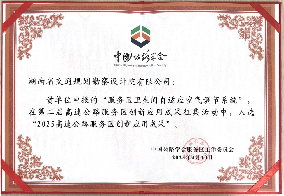 近日,2025年中國(guó)公路學(xué)會(huì)服務(wù)區(qū)創(chuàng)新應(yīng)用成果推廣交流會(huì)在揚(yáng)州召開(kāi),湖南省交通規(guī)劃勘察設(shè)計(jì)院有限公司建筑設(shè)計(jì)院作品《服務(wù)區(qū)衛(wèi)生間自適應(yīng)空氣調(diào)節(jié)系統(tǒng)》獲2025高速公路服務(wù)區(qū)創(chuàng)新應(yīng)用成果綠色低碳類(lèi)獎(jiǎng)項(xiàng)。 本次活動(dòng)舉辦旨在持續(xù)推進(jìn)全國(guó)高速公路服務(wù)區(qū)領(lǐng)域創(chuàng)新應(yīng)用成果交流...