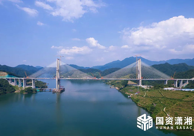7月7日上午,隨著最后一塊橋面板精準(zhǔn)吊裝到位,雪峰湖大橋成功實現(xiàn)合龍。這也標(biāo)志著官新高速全線順利貫通,距離今年底通車的目標(biāo)更進(jìn)一步。雪峰湖大橋位于益陽市安化縣境內(nèi),橫跨柘溪水庫,全長1187米,主跨500米,兩個主塔均采用H形設(shè)計,其中陸上7號主塔高155 9米,水中6號主塔高202 4米,為雙塔雙索面半漂浮體系斜拉橋,是湖南省最大跨度鋼混組合梁斜拉橋。